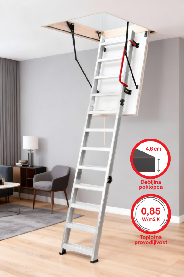 – AluBAU merdevine za potkrovlje odlikuju jednostruki zaptivači i debljina otvora od 46mm.