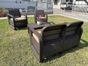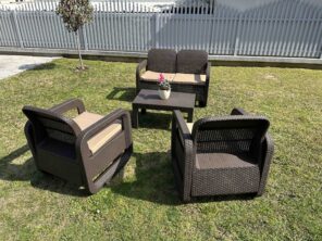 Sastoji se od dve udobne fotelje, dvoseda i praktičnog stola, idealnog za odlaganje pića, knjiga ili dekorativnih predmeta. Svaki element je pažljivo izrađen od kvalitetnog ratana, poznatog po svojoj otpornosti na vremenske uslove, što garantuje dug vek trajanja.