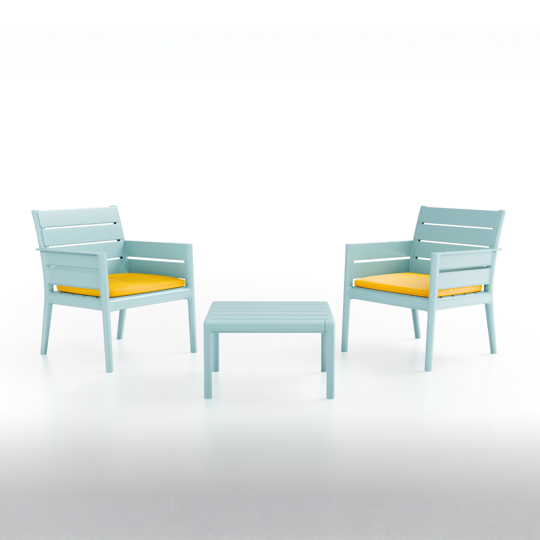 ✅ Set za 2 osobe sadrži: 2 fotelje i sto.